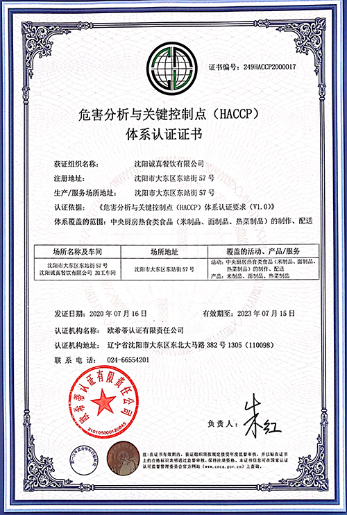 危害分析與關(guān)鍵控制點(diǎn)(HACCP)體系認(rèn)證證書